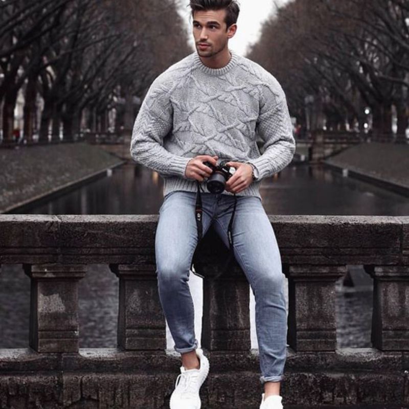Bản phối nam tính cùng áo len và quần jeans