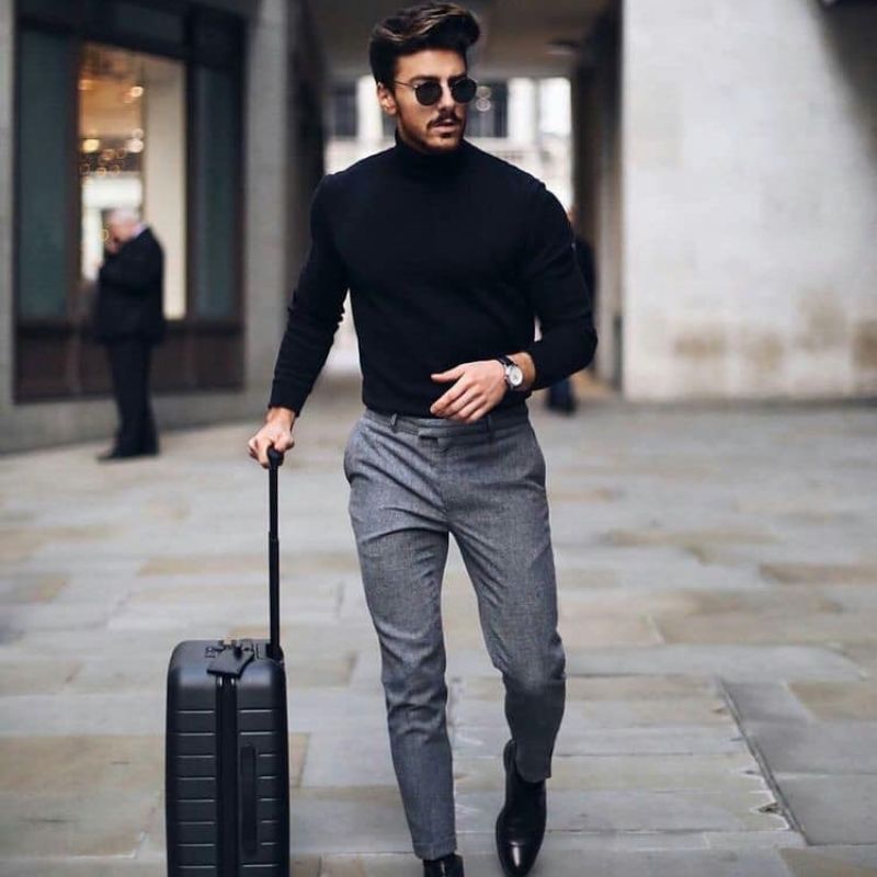 Nếu muốn tôn thêm vẻ lịch lãm của cánh mày râu, chàng cũng có thể phối áo len cổ lọ cùng với quần âu, đồng thời chọn thêm cho mình chiếc áo khoác dạ dáng dài ở bên ngoài khi thời tiết lạnh. Outfit này sẽ khiến chàng tự tin hơn mà không bao giờ lo lỗi mốt. Thêm một chiếc boots đen bóng loáng nữa thì vô cùng phù hợp cùng phong cách thời trang này.