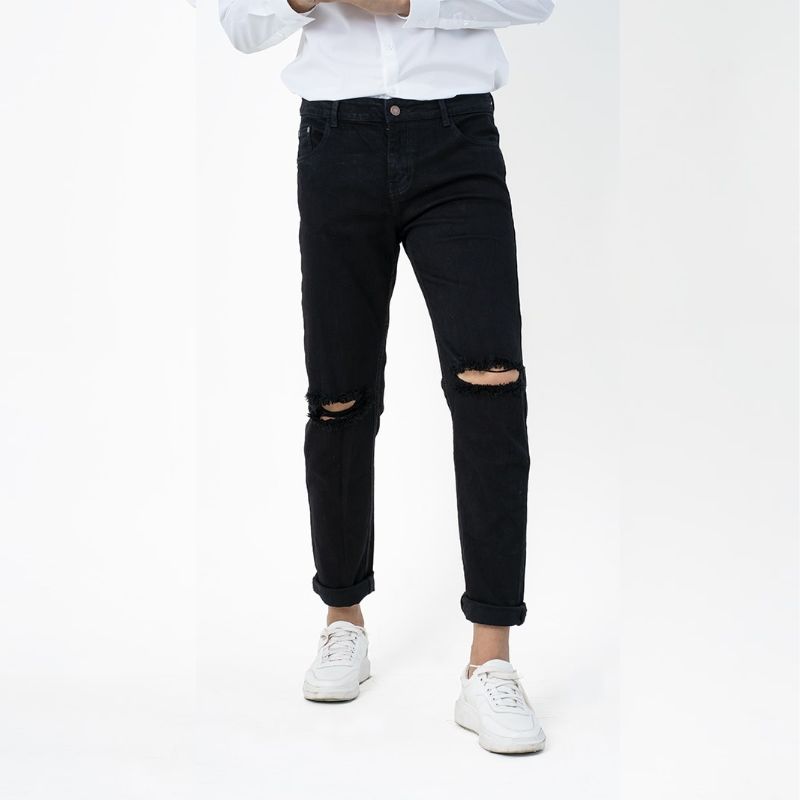 Quần jean nam ống đứng rách gối mix & match cùng áo sơ mi trơn